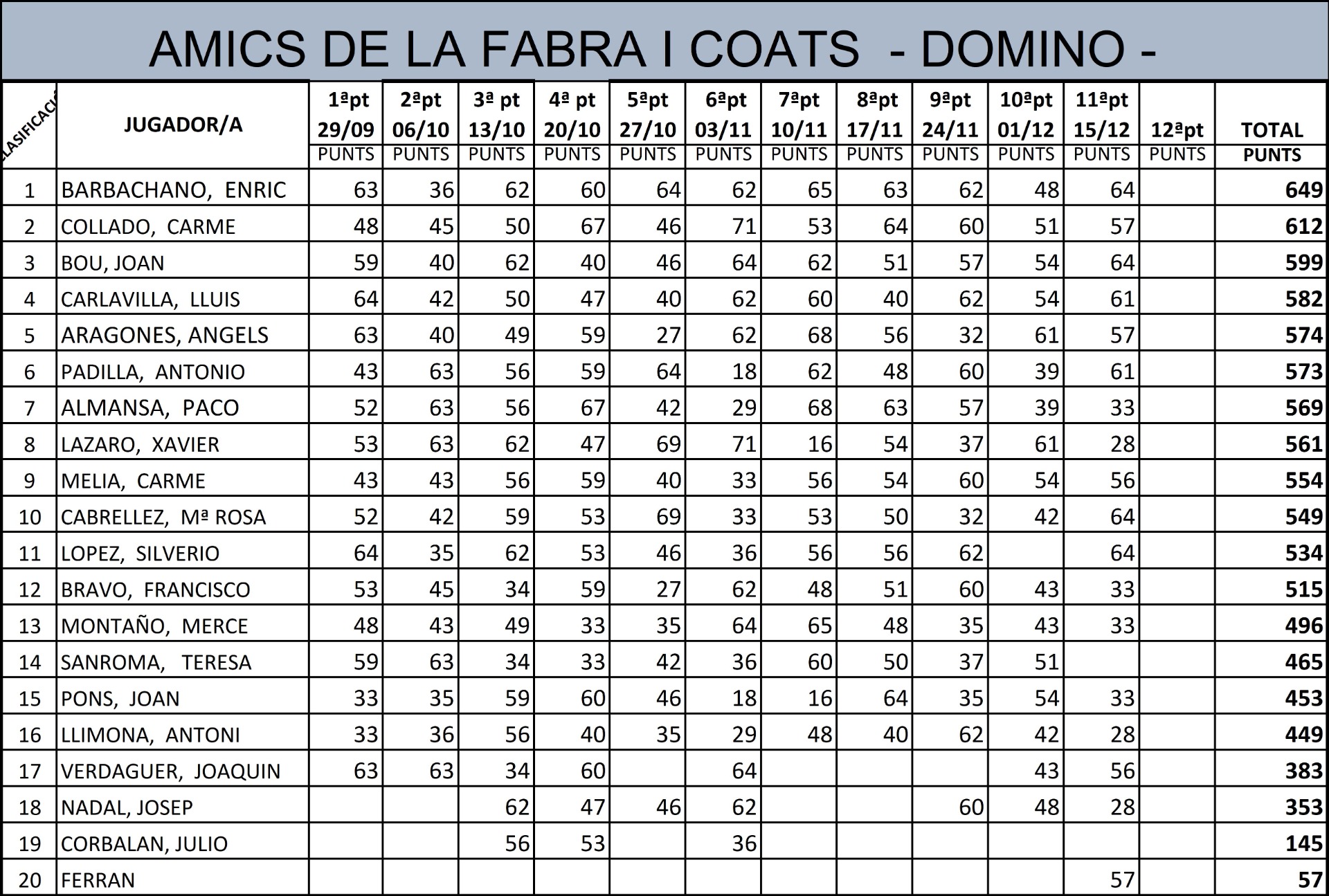 Llistat clasificació del 29/09/2025 al 15/12/2025