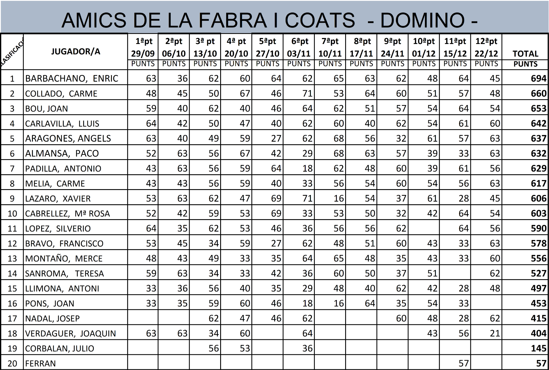Llistat clasificació del 29/09/2025 al 22/12/2025